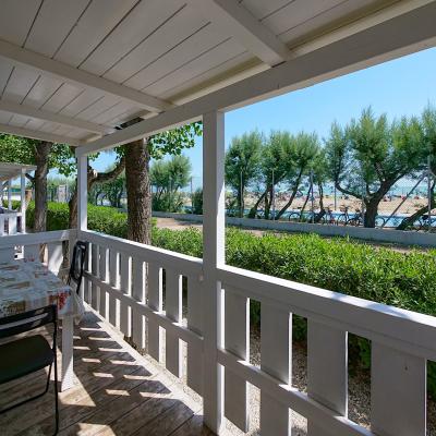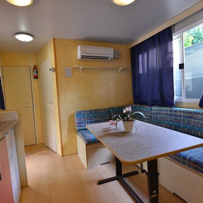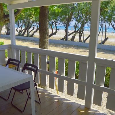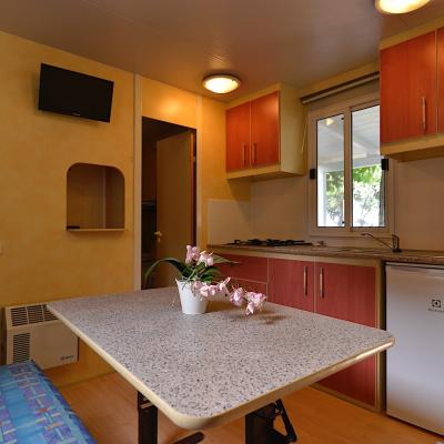 Located in the first row to the sea, our mobile homes are well finished and shaded, close to the beach, they are still close to the swimming pool, the mini market and the restaurant. They have a large veranda with table and chairs. They can comfortably accommodate up to 4 people with the option of a 5th place. The kitchen is equipped with cookware, Moka, cutlery, cups and glasses. 4-burner stove, undercounter refrigerator.